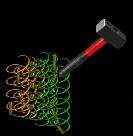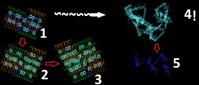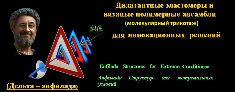 Пояснения терминов. * Дельта - аббревиатура, кроме того. дельта - обозначение изменения, разницы. От финикийской буквы, обозначающей вход. **Дилатантные эластомеры – вязаные (молекулярный трикотаж) ансамбли полимеров – анфилады молекулярных блоков и анфилада продуктов для общества. ***Анфила́да (фр. enfilade от enfiler — «нанизывать на нитку» или от a’ la file — «один за другим») — ряд последовательно примыкающих друг к другу пространственных элементов (помещений, дворов, градостроительных пространств), проёмы которых расположены на одной продольной оси. Идея «взаимопроникающих пространств» лежит в основе архитектурного приёма анфилады. На конкретных примерах покажем суть и ценность нашей последней технологической разработки. Мы занимались работой в области поиска наиболее приемлемых в технологическом отношении материалов, работающих в условиях ударных нагрузок (material that works under impact loads). Термо-крио-требования и устойчивость к механическим воздействиям заставляли нас искать кандидатуры, близки (по функциональности и, соответственно, строению) к ПУ/полимочевинам. Возник вопрос: какие процессы в механике сплошных сред могут обеспечивать более быстрый набор прочности, чем кристаллизация? И возобновлять работу не единожды? Так дилатансия!! Известная с 1886 года и описанная, как эффект увеличения объёма в плотно упакованных гранулированных материалах, когда те подвергаются сдвиговым деформациям. Если по дилатантной жидкости ударить кулаком – она будет, как бетон. (Дилатантные жидкости (дилатантные материалы) — это такие материалы, у которых вязкость возрастает при увеличении скорости деформации сдвига. Такие жидкости являются одним из видов неньютоновских жидкостей. Дилатантный эффект наблюдается в тех материалах, у которых плотно расположенные частички перемешаны с жидкостью, заполняющей пространство между частичками. (ru.wikipedia.org Дилатантные жидкости — Википедия). (ru.wikipedia.org Дилатантные жидкости — Википедия). Подробнее об истории разработки - навести курсор на заголовок и нажать.левой клавишей мыши Иллюстрация картинкой: 1 - зафиксированная инверсией (вплоть до эверсии) структура эластомерного сополимера. Цилиндрические спирали - эластомеры (разный цвет = разные эластомеры). Шайбы гровера (лазоревого цвета) - кристаллитная часть пикомодулятора. Крепит молекулярные цепи за счёт координационных связей и пр. 2 и 3 - предполагаемые структуры, которые должны бы были образовываться при наложении вязаных молекулярных полотен друг на друг - двойной слой и тройной слой. Однако (4!), на компьютерной модели не получалось сшитого (сетчатого) полимера. А образовывался полимер с петлями (топологически), узлами (геометрически). Этот макросополимер с петлями при дальнейших попытках сшивки "упрямо" давал супер- макро-сополимер (5!), где полученные ранее полимеры выполняли роль блоков. То есть, образовавшаяся резина показывала фрактальный характер. Но. Работала в материальном воплощении даже лучше, чем сшитые собратья. То, что это вязаный (в отличие от сшитых) материал, было недостаточным объяснением. Механическая прочность, высокая эластичность и даже устойчивость к обычным растворителям заставляли нас искать дополнительные объяснения. И оно было найдено: это взаимопрониникающая "сетчатая вязка" (вида: